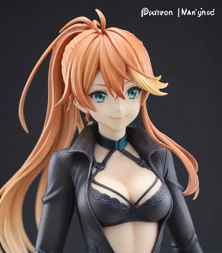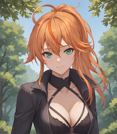 <lora:JudithGoldenBlood:0.9>, Judith Ranster, 橙色头发,条纹发,多彩发,马尾,天线发,水蓝色眼睛,中等胸部,黑色紧身衣,露肤服饰,乳沟,胸罩,黑色手套,