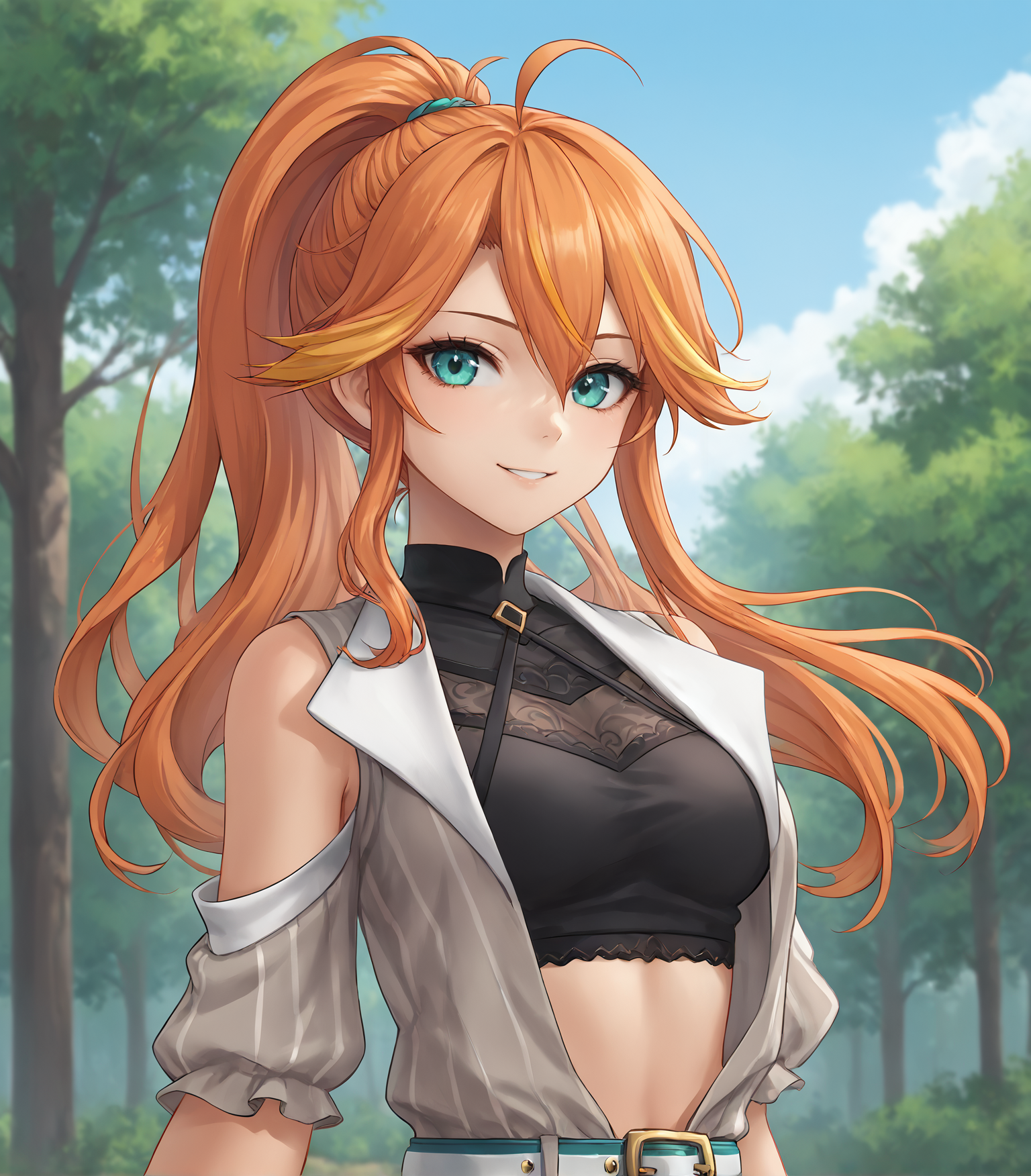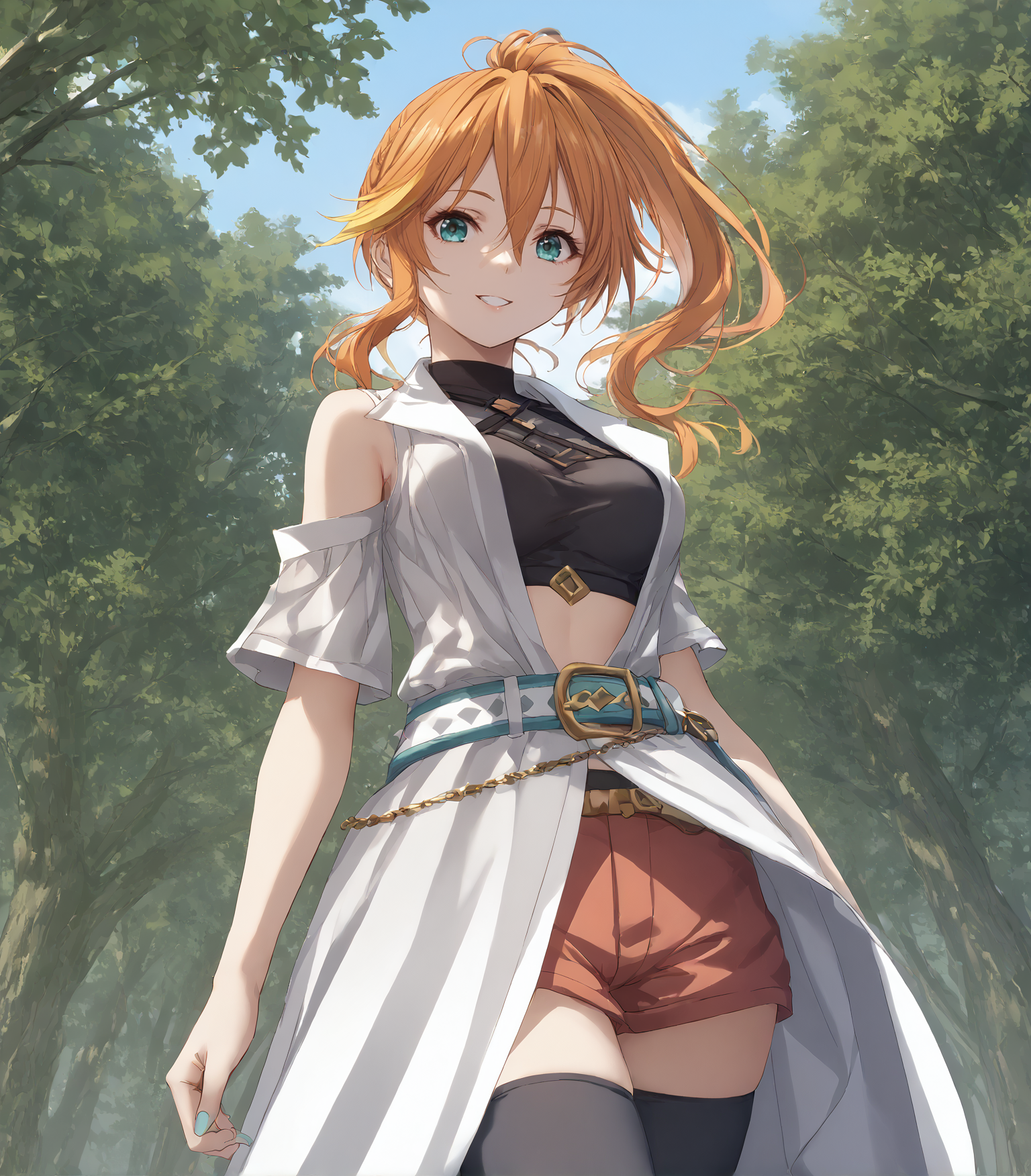 <lora:Judith:0.9>, Judith Ranster, orange hair, streaked hair, multicolored hair, ponytail, ahoge, aqua eyes, medium breasts, crop top, open dress, detached sleeves, belt, orange shorts, black thighhighs, aqua high heels,