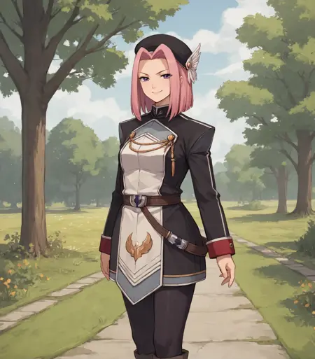 <lora:KanoneAmalthea:0.9>, Kanone Amalthea, pink hair, parted bangs, purple eyes, medium breasts, beret, military uniform, coat, skirt, black pantyhose, boots, smug,