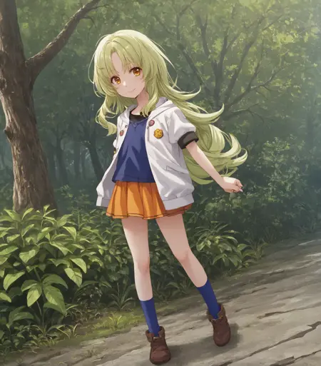 <lora:KeA:0.9>, KeA, 緑色の髪, 長い髪, 黄色い目, 平らな胸, 白いフーディー, 開いたフーディー, バッジ, ピン, 青いシャツ, オレンジのスカート, 青い靴下, 茶色の靴,