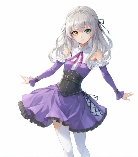 <lora:LapisRosenbergKai:0.9>, Lapis Rosenberg,灰发,长发,编发,黑色丝带,异色瞳,黄与青色眼睛,小胸,紫色连衣裙, detach sleeves,裸露肩膀,白色领子,紫色丝带,黑色束腰,白色过膝袜,玛丽珍鞋,