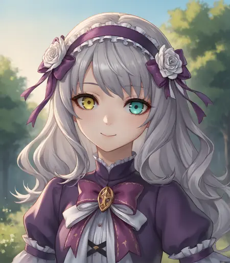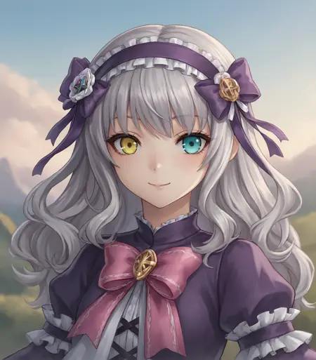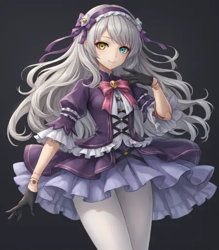 <lora:LapisRosenberg:0.9>, Lapis Rosenberg, grey hair, long hair, heterochromia, yellow and aqua eyes, doll joints, headband, hair ornament, purple dress, gothic lolita, frills, ribbons, white pantyhose, black gloves, purple shoes,