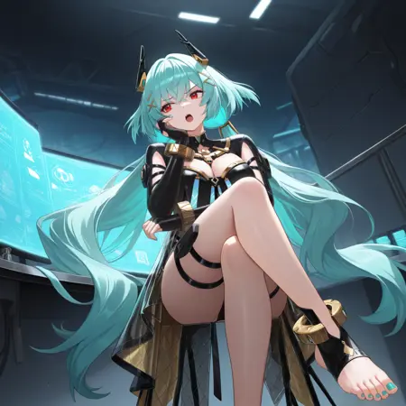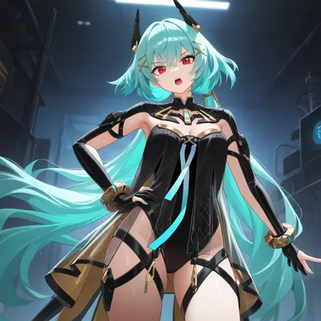 OsrAusAG, Osr_Aus, 빨간 눈, 청록색 헤어, 낮은 트윈테일, 매우 긴 머리, 금색 머리핀, X 머리 장식, 헤드기어, 검은 쉬리그, 쉬리그(옷), 손목을 넘어가는 소매, 다리 노출, 가슴 노출, 옆 슬릿, 금색 팔찌, 보석, 검은 레오타드, 옷 아래 레오타드, 옷 절개, 팔 스트랩, 연한 파란 스톨, 하이레그 레오타드, 투명 드레스, 투명, 십자 끈, 여러 허벅지 스트랩, 투명 스커트, 투명 골반 커튼, 십자 허벅지 스트랩, 레오타드, 반소매, 부분적으로 손가락이 없는 장갑, 장갑 소매, 긴 소매, 검은 소매, 겨드랑이 절개, 팔 절개, 팔 노출, 스터럽 하의, 검은 발가락 없는 신발, 청록색 손톱, 네일 폴리쉬,