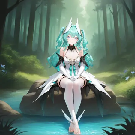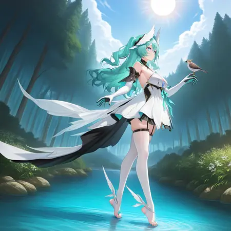 OsrAusAG, Osr_New, 波浪发, 两侧上梳, 水蓝色头发, 浅蓝色眼睛, 长发, 无袖连衣裙, 替代白色连衣裙, 黑色颈环, 露肩, 水蓝色丝带, 肘部手套, 脚踝羽翼, 双面裙摆, 腰部披风, 黑色镶边, 头部羽翼, 黑色袖子, 双面手套, 白色过膝袜, 过膝袜, 婚纱腿饰, 黑色吊袜带, 可拆卸袖子, 透视胸线, 多条大腿绑带, 黑色大腿绑带, 白色紧身衣, 水蓝色脚趾甲,