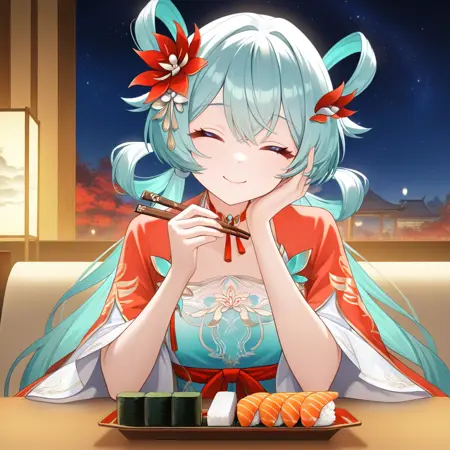 OsrAusAG, Osr_JP, 浅蓝色眼睛, 发环, 长发, 双马尾, 日式服饰, 短裙, 层叠裙装, 白色上衣, 水蓝色连衣裙, 汉服, 水蓝色头发, 渐变裙装, 胸针, 宝石, 袖子超过肘部, 花饰发饰, 珠子, 红花, 流苏项圈, 红色项圈, 低胸设计, 红色丝带, 长丝带, 红色外套, 外套, 和服, 红色和服, 红色袖子, 开放式服装, 层叠袖子, 白色袖子, 双色袖子, 宽袖, 透视袖子, 白色平底鞋,