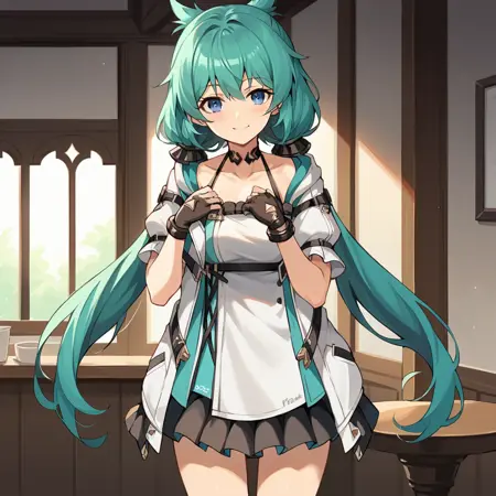 OsrAusAG, Osr_Def, blue eyes, aqua hair, low twintails, twin braids, very long hair, strap dress, frilled dress, white dress, spiked hair, spaghetti strap, black strap, aqua trim, hooded jacket, white jacket, open jacket, glove cutout, two-sided hood, hood down, puffy short sleeves, white sleeves, multiple belts, sleeve belt, open belt, black belt, frilled skirt, black skirt, thigh pouch, black gloves, partially fingerless gloves, black bracelet, collarbone, cross-laced choker, black choker,