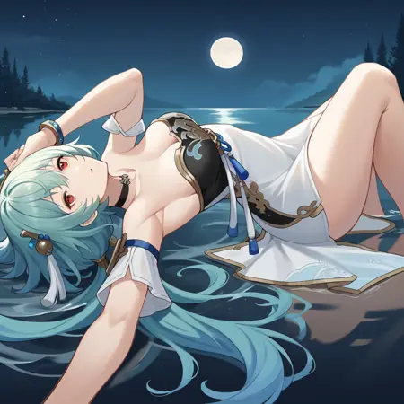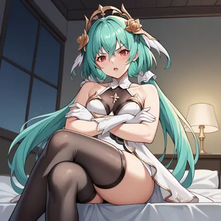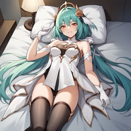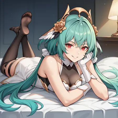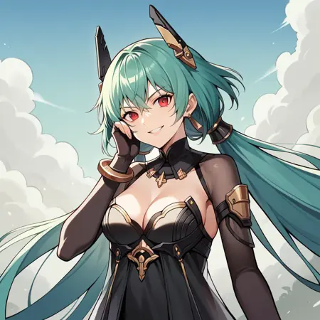 Osiris, Osir_CN, aqua hair, red eyes, very long hair, low twintails, coral hair ornament, black choker,