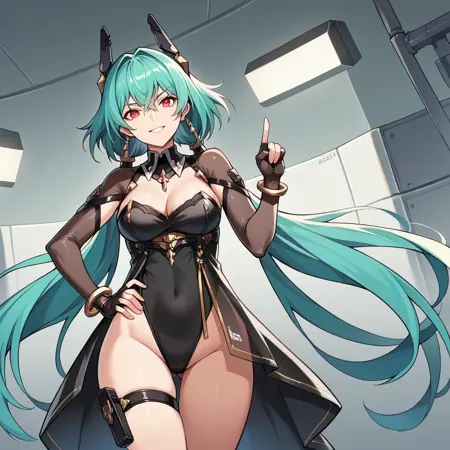 black leotard, highleg leotard, cleavage, detached collar, black dress, black gown, see-through dress, black gloves, shoulder gloves, thigh straps, fingerless gloves, bracelet, covered navel, jewelry, aqua ribbons,