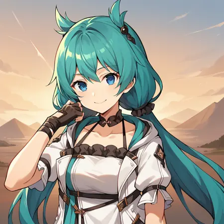 Osiris, Osir_Def, aqua hair, blue eyes, very long hair, low twintails, hair ornament, braid