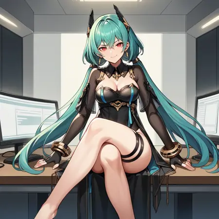 OsrAusAG, Osr_Aus, red eyes, aqua hair, low twintails, very long hair, gold hairclip, x hair ornament, headgear, black shrug, shrug (clothing), sleeves past wrists, bare legs, cleavage, side slit, gold bracelet, jewelry, black leotard, leotard under clothes, clothing cutout, arm strap, light blue stole, highleg leotard, see-through dress, see-through, criss-cross straps, multiple thigh straps, see-through skirt, see-through pelvic curtain, criss-cross thigh straps, leotard, half-sleeves, partially fingerless gloves, gloved sleeves, long sleeves, black sleeves, armpit cutout, arm cutout, bare arms, stirrup legwear, black toeless footwear, aqua nails, nail polish,