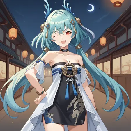 OsrAusAG, Osr_CN, red eyes, aqua hair, low twintails, very long hair, chinese clothes, miniskirt, strapless dress, emblem, blue tassel, light blue tassel, blue stole, black dress, print dress, leg tattoo, vertical stripe, single stripe, high-waist skirt, open skirt, white skirt, blue rope, detached sleeves, white sleeves, short sleeves, gradient sleeves, multiple bracelets, black choker, tassel hair ornament, horns, coral horns, ankle strap, bare shoulders,