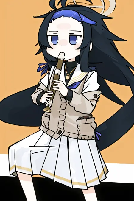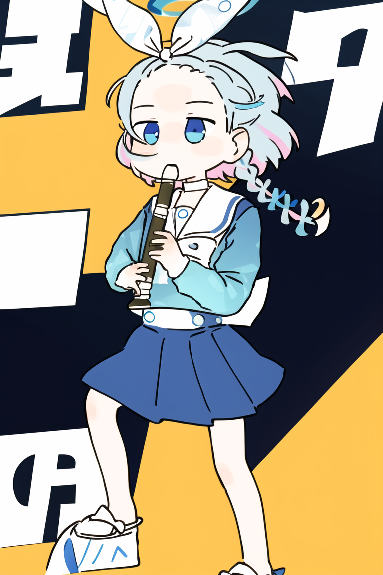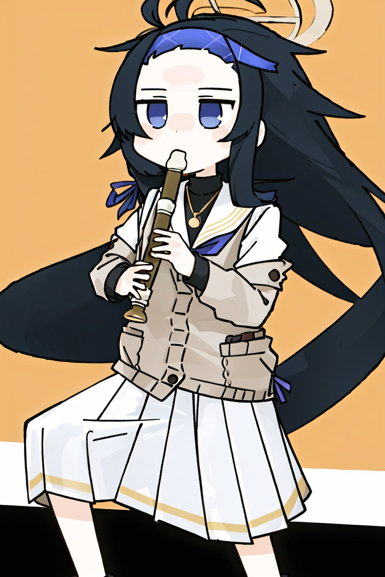 推荐提示:kyoufuu all back, 1girl, solo, simple background, holding, standing, full body, instrument, child, playing instrument, holding instrument, recorder