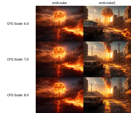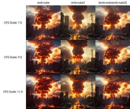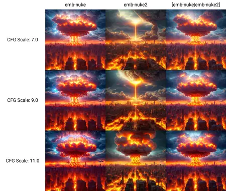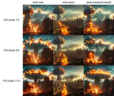 我上传了新的嵌入(embedding),以及几周前本应被替换的那个版本。可惜的是,两者都不完美,各有优劣,因此我将它们都放出来,并使用X/Y对比图来并排展示,以及结合提示词编辑进行对比。使用 [emb-nuke|emb-nuke2] 在两者之间切换。emb-nuke 更好地理解了概念,但有时会过于主导画面,效果不一定真实。emb-nuke2 则生成了更出色的翻滚烟雾,云层细节也更出色。不过它并不总是让烟雾呈现出爆炸的形状。我通过提示词编辑在初期就从蘑菇云切换为核爆炸,以防止画面中到处出现蘑菇云,因为SD模型比较特殊。你可以在后面网格图的第三列看到,当两者结合时,保留了v1的良好概念,同时也具有风格压制的效果;而中间列(v2)则让更多的提示词和模型特性得以呈现。然而,组合效果的呈现比v1单独的效果更好。