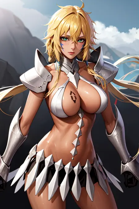 outfit2 (not mask)th1, facial mark, large breasts, long hair, gloves, revealing clothes, armor, breasts tattoo, skirt