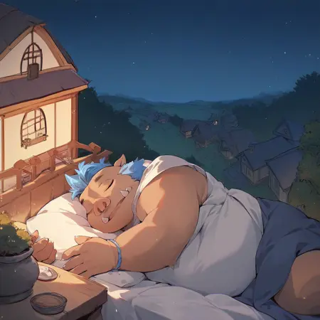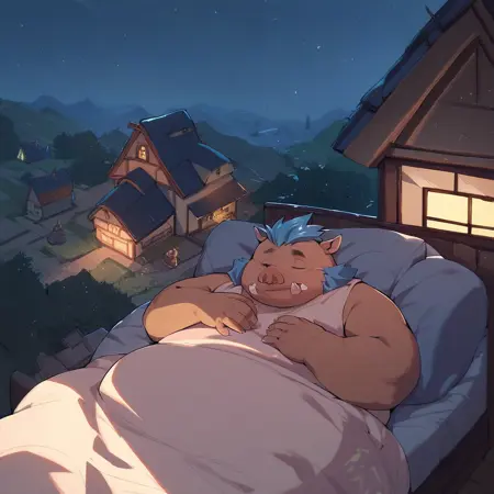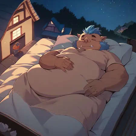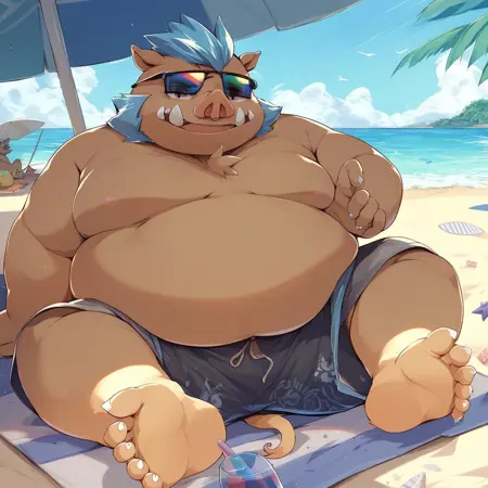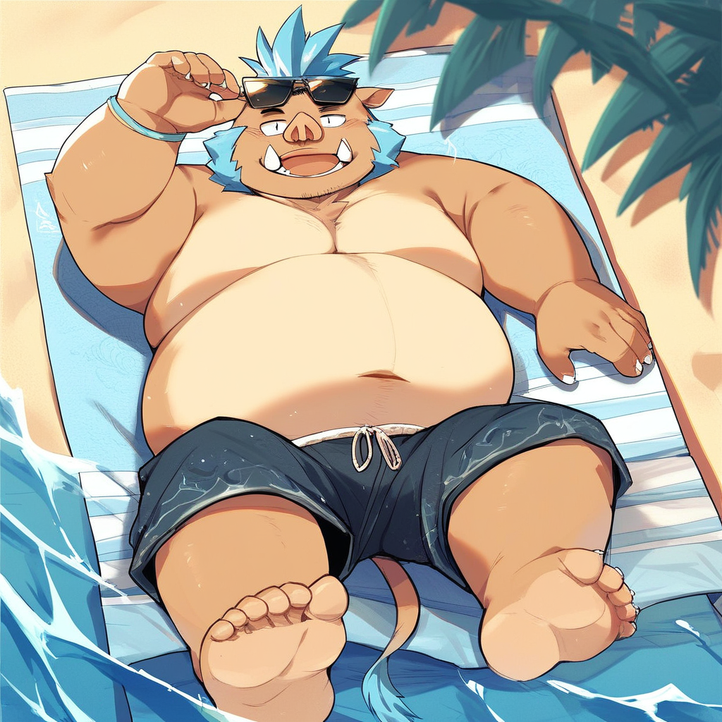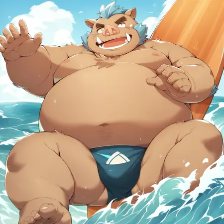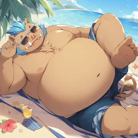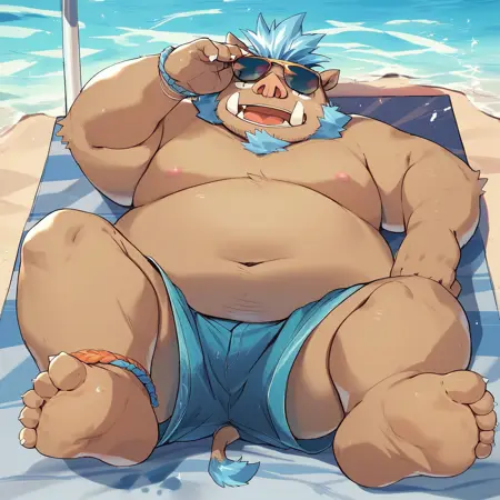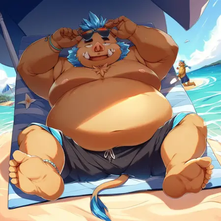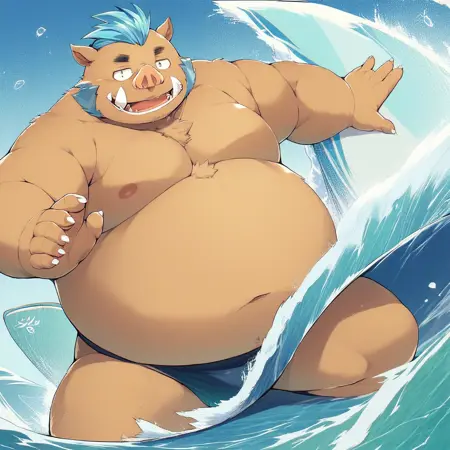 Best Positive Input: (ganglie, housamo, anthro, pig, boar, fat, obese, light brown body, blue hair, five toes)