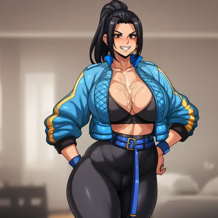 衣装の参考:濃い青のジャケット、ポニーテール、長い青いベルト