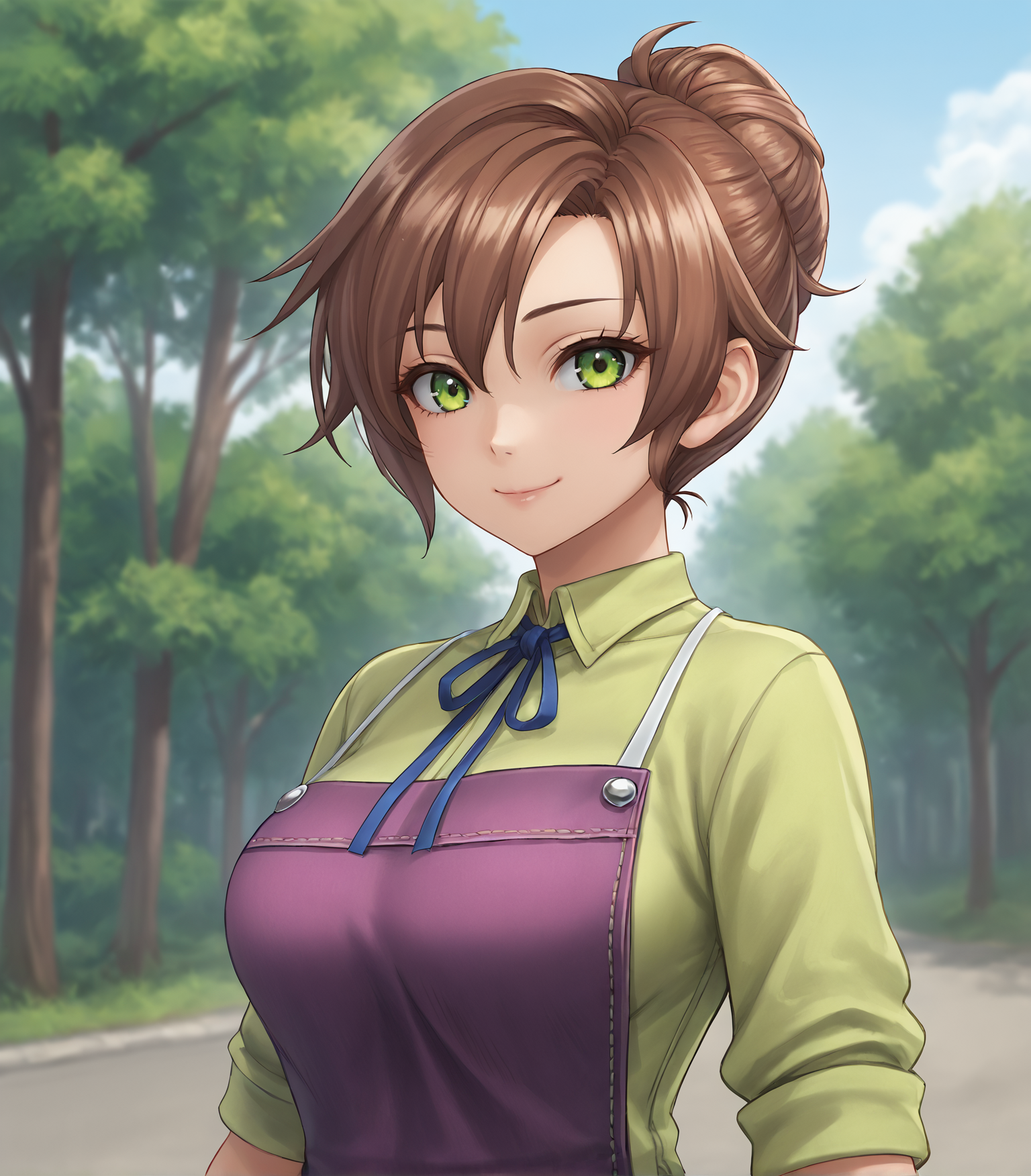 <lora:MarthaHerschel:0.9>, Martha Herschel, green eyes, brown hair, medium hair, hair bun, large breasts, green dress, blue ribbon, purple apron, capri pants, green shoes,