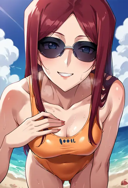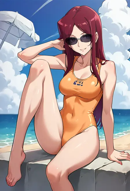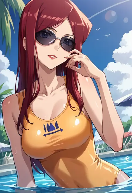 衣装2: ct_sc4rlet、赤髪、長髪、黄色いワンピース水着、サングラス、