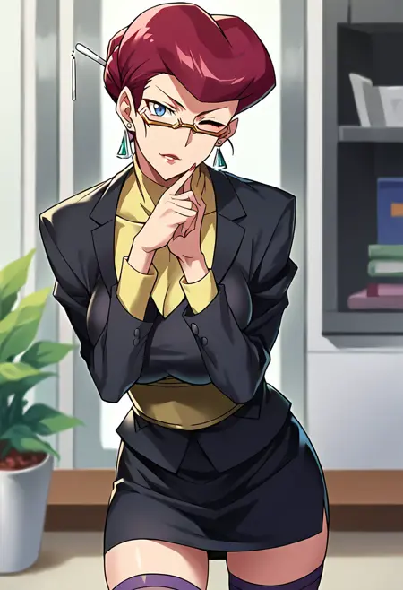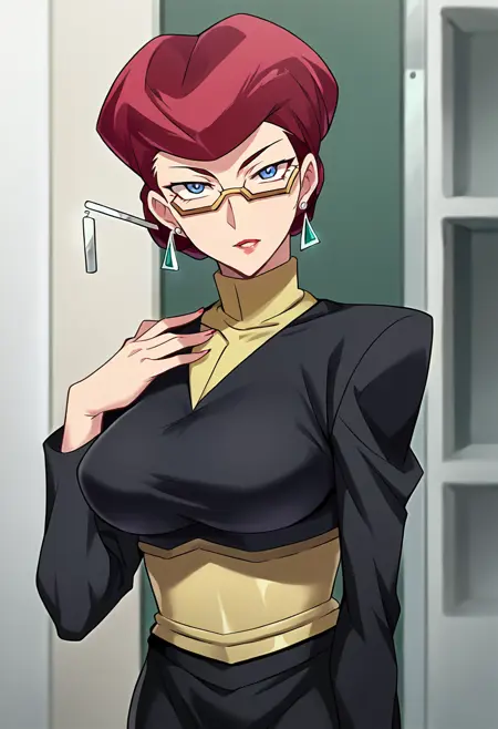 score_9, score_8_up, score_7_up, source_anime, masterpiece, 1girl, ct_sc4rlet, red hair, short hair, hair bun, hair stick, large breasts, semi-rimless eyewear, earrings, black uniform, black pencil skirt, underbust, long sleeves, looking at viewer, indoors, cowboy shot, upper body, hand up,