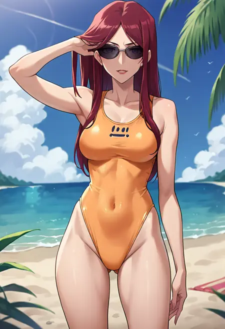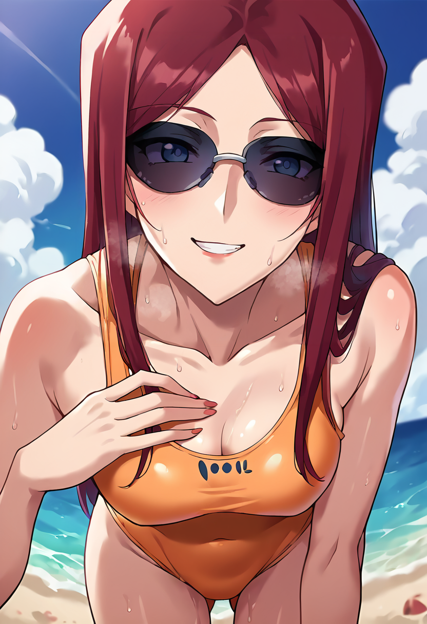 Clothing 2: ct_sc4rlet, red hair, long hair, yellow one-piece swimsuit, sunglasses,