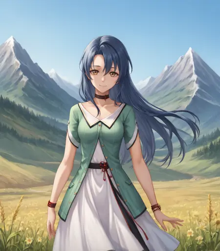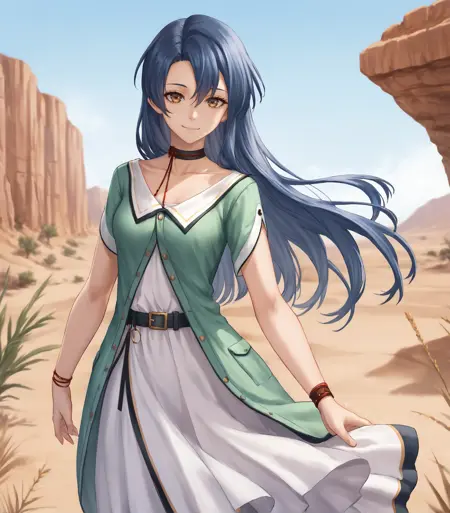 <lora:NinaFenly:0.9>, Nina Fenly, dark blue hair, long hair, brown eyes, petite, medium breasts, green jacket, white dress, belt, red high heels, choker, bracelet,