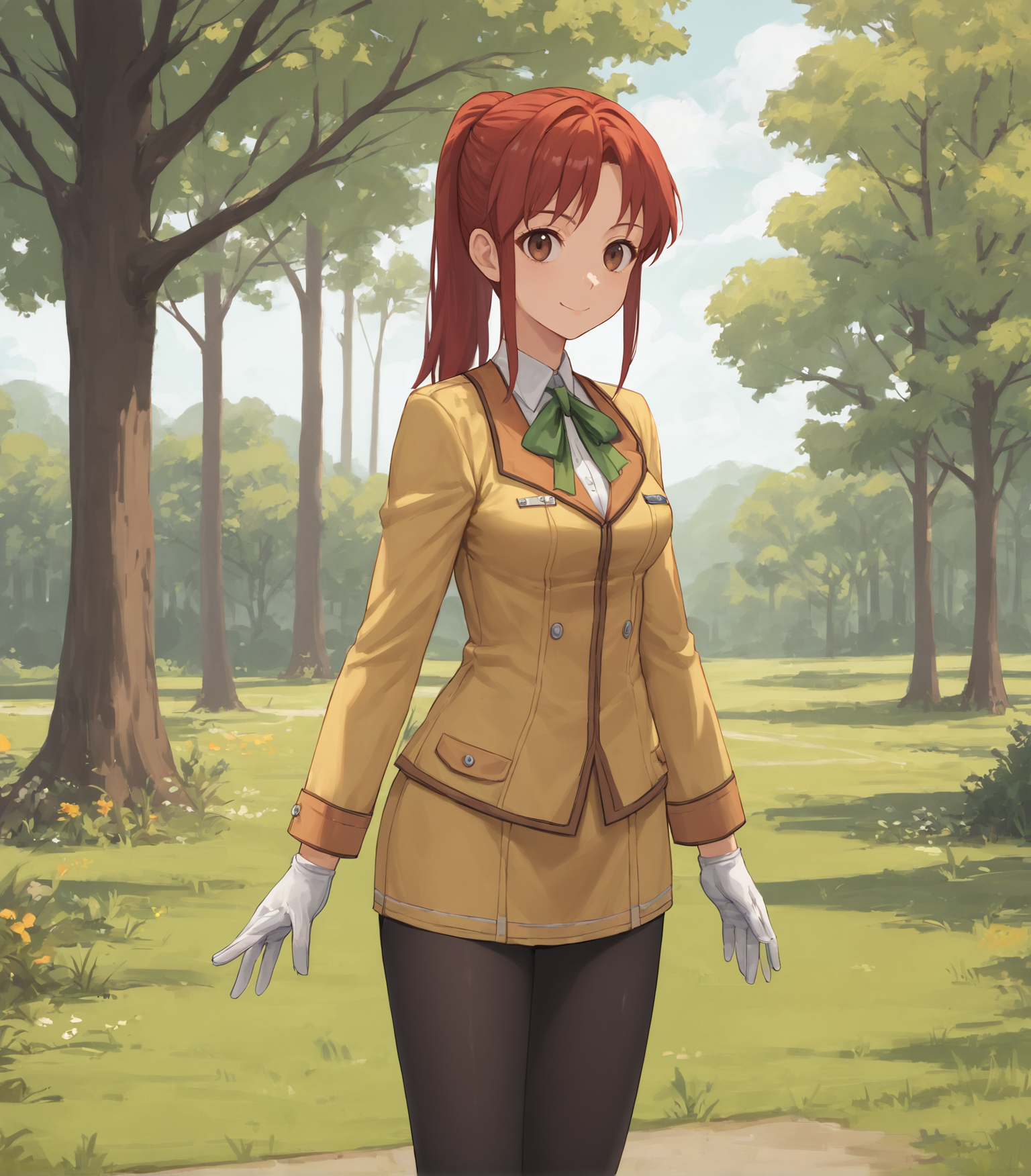 <lora:Patiry:0.9>, Patiry, 红发, 马尾, 棕色眼睛, 中等胸部, 绿色丝带, 黄色制服, 黑色连裤袜, 白色手套, 棕色鞋子