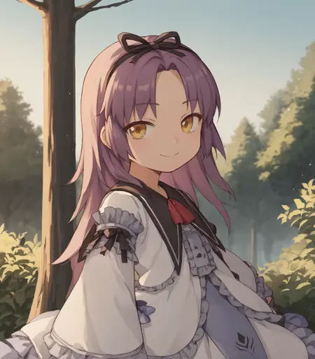 <lora:Renne:0.9>, Renne, 黄色眼睛, 分开的刘海, 发带, 紫色头发, 长发, 年轻, 白色连衣裙, 花边, 丝带, 黑色水手领, 红色领结, 白色袜子, 圆头鞋,