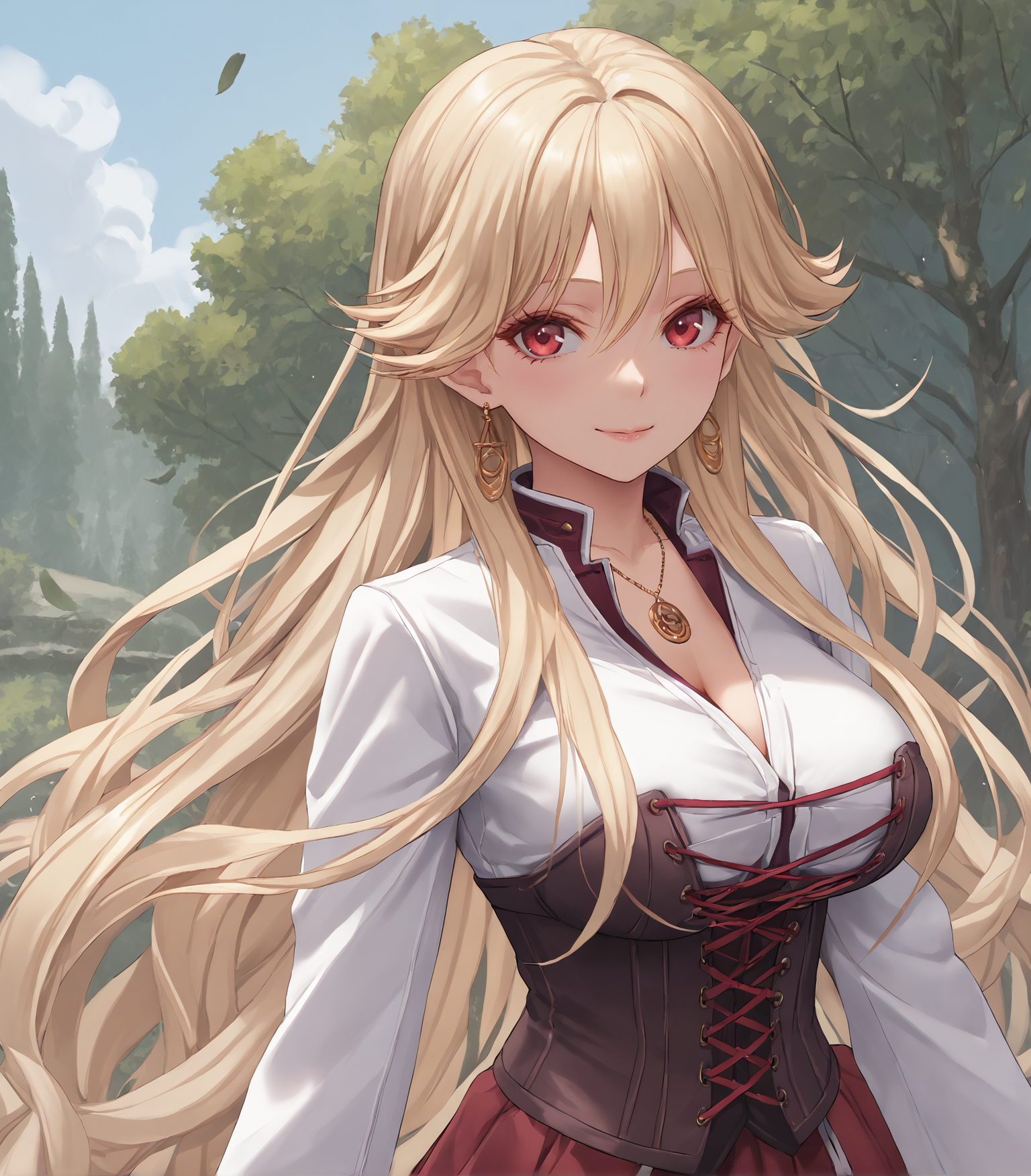 <lora:RoseliaMillsteinOlder:0.9>, Roselia Millstein, 금발, 매우 긴 머리, 붉은 눈, 큰 가슴, 목걸이, 귀걸이, 흰 셔츠, 가슴 부분 드러남, 긴 소매, 빨간 끈으로 매인 코르셋, 긴 치마, 빨간 치마, 보라색 팬티스타킹, 갈색 부츠,