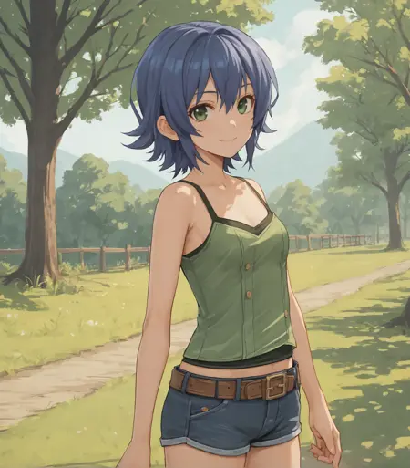 <lora:Sully:0.9>, Sully Atraid、青い髪、短髪、緑の目、小柄、小さな胸、緑のトップ、カミソール、ジーンズショート、茶色のベルト、ホットパンツ、白い靴下、スニーカー、