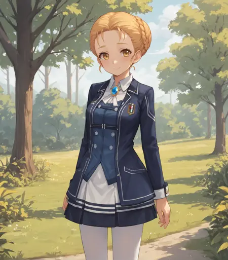 <lora:Tatiana:0.9>, Tatiana, blonde hair, hair bun, short hair, yellow eyes, medium breasts, blue blazer, blue waistcoat, white skirt, white pantyhose, short boots, black boots, brooch, shy,