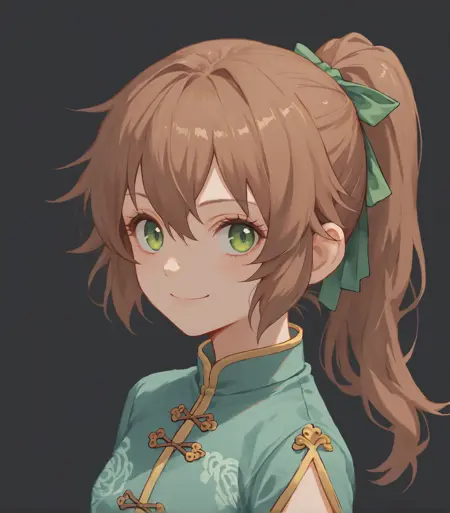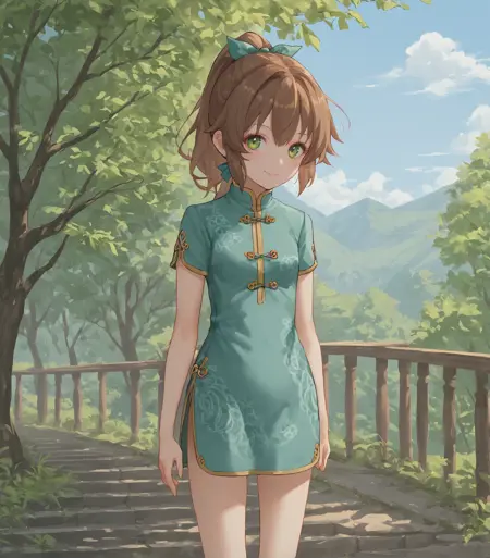 <lora:TowaHerschelQipao:0.9>, Towa Herschel, 茶色の髪, ポニーテール, 髪リボン, 緑の目, 小柄, 小さな胸, 中国風の衣装, 緑のドレス, 緑の靴,