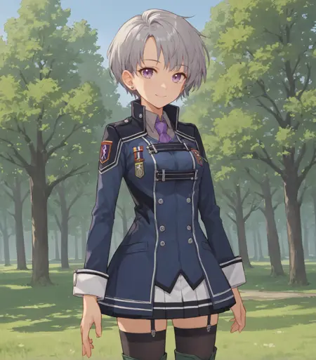 <lora:Valerie:0.9>, Valerie, grey hair, short hair, purple eyes, purple ear studs, blue military uniform, long sleeves, purple neckwear, black thighhighs, garter straps, green boots,