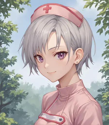 <lora:ValerieNurse:0.9>, Valerie, grey hair, short hair, purple eyes, purple ear studs, nurse outfit, nurse cap, black pantyhose, white shoes,