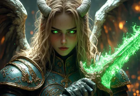 "A woman's face with glowing red eyes and green vines growing on her skin, in the forest, fantasy art style, hyper realistic, cinematic, close up, sharp focus, pov from the side. hkevil. masterpiece, best quality, highly detailed, sharp focus, dynamic lighting"