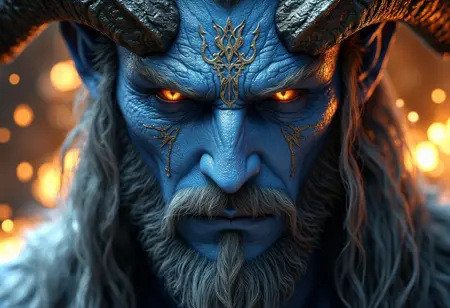 "masterpiece, best quality, amazing quality, very aesthetic, high resolution, absurdres, newest, photorealism, realistic,, 1boy, man , male, Close up portrait of an ancient blue-skinned tiefling with golden accents, blue skin, he has long hair and beard and horns on his head, in the style of fantasy art, cinematic, octane render, hyper detailed, volumetric lighting, cinematic shot, in the style of artstation. hkevil"