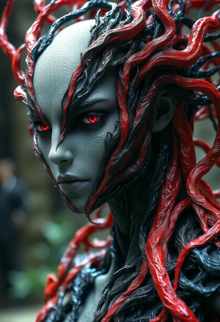 "A humanoid creature made of intertwined black and red vines, with gray skin, in a dark fantasy style, digital art portrait, pov from the side. hkevil, masterpiece, best quality, highly detailed, sharp focus, dynamic lighting:1.2) hkevil, masterpiece, best quality, highly detailed, sharp focus, dynamic lighting"