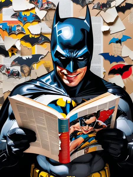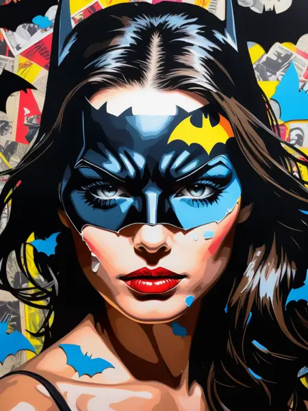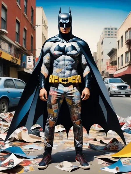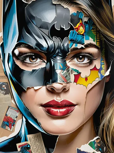 (", collage, collage on face, torn paper effect on face, pop art, comic book, Batman, Robin, superhero, visual effect poster, vintage poster, art painting, artistic style,,...등")