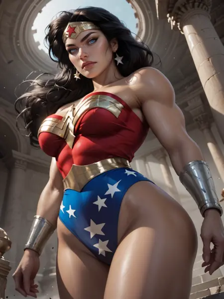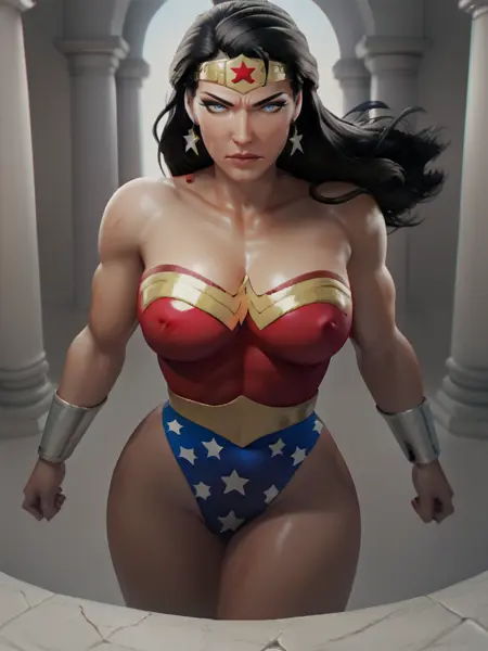 히어로 프롬프트: Diana, 1girl, long hair, tiara, blue eyes, leotard, star (symbol), boots, bracers, black hair,