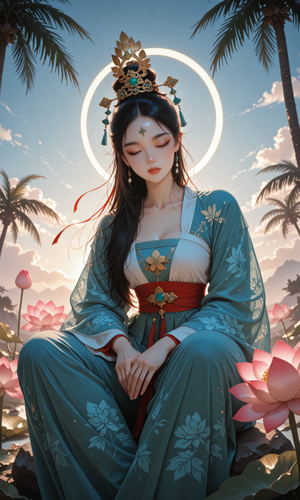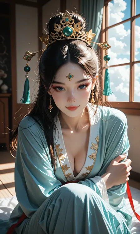 (1girl/immortal, jewelry, earrings, red lips, long sleeves, chinese clothes, cyan hanfu, hair bun, shawl, ribbon, Phoenix Crown, Biyao, Jade Ornaments, Floral Ornaments, armor, Hair Pin, Hair Comb, Golden Forehead Ornament, Beaded Strands, cleavage, huge chest), fog, clouds, mountain, floating in mid air, floating in sky, statdust,