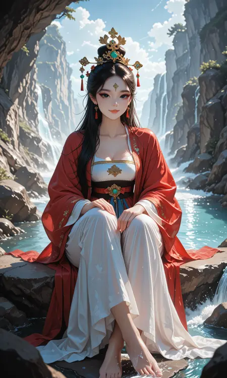 在 strength_model = 1 时,此模型可以模拟敦煌壁画的某些艺术特征,比如山、云、雾、飘带、以及人物形象等。
