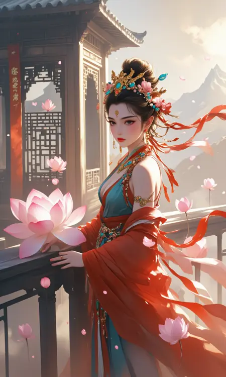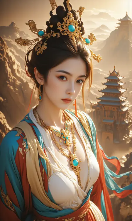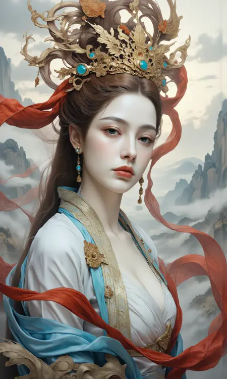 At strength_model = 1, this model can simulate certain artistic characteristics of Dunhuang murals, such as mountains, clouds, mist, fluttering ribbons, and human figures.