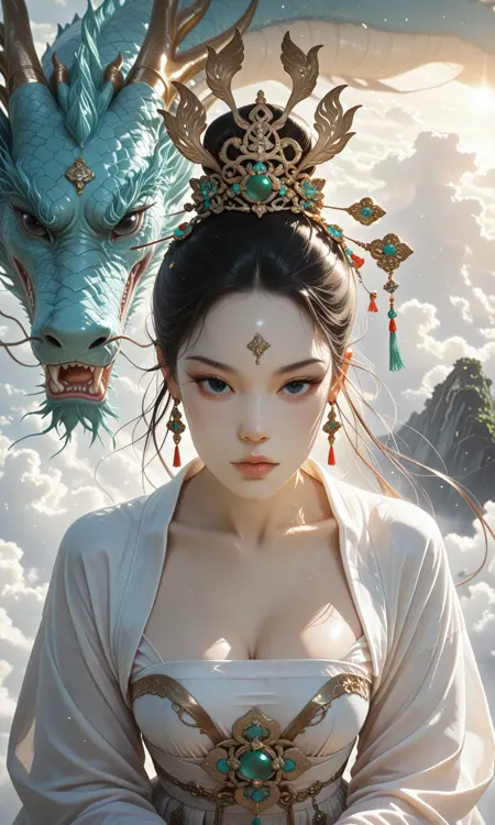 (1girl/immortal, jewelry, earrings, red lips, long sleeves, chinese clothes, cyan hanfu, hair bun, shawl, ribbon, Phoenix Crown, Biyao, Jade Ornaments, Floral Ornaments, armor, Hair Pin, Hair Comb, Golden Forehead Ornament, Beaded Strands, cleavage, huge chest), fog, clouds, mountain, floating in mid air, floating in sky, statdust,