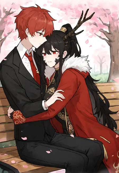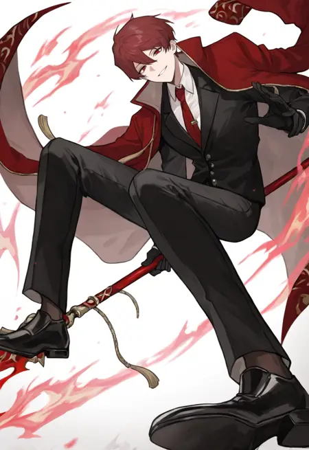 white shirt, red necktie, black jacket, red coat, high-neck coat, open coat, black pants, black footwear