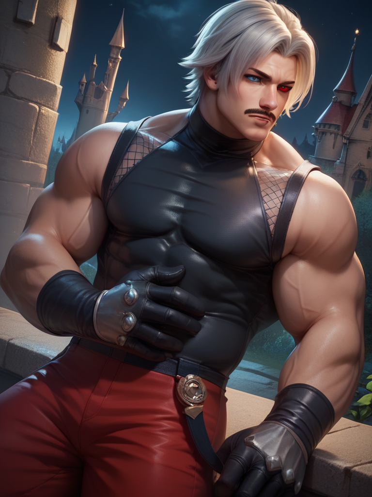 RugalIL, 1boy, male focus, mature male, mustache, blue eyes, red eyes, heterochromia, short hair, grey hair, muscular