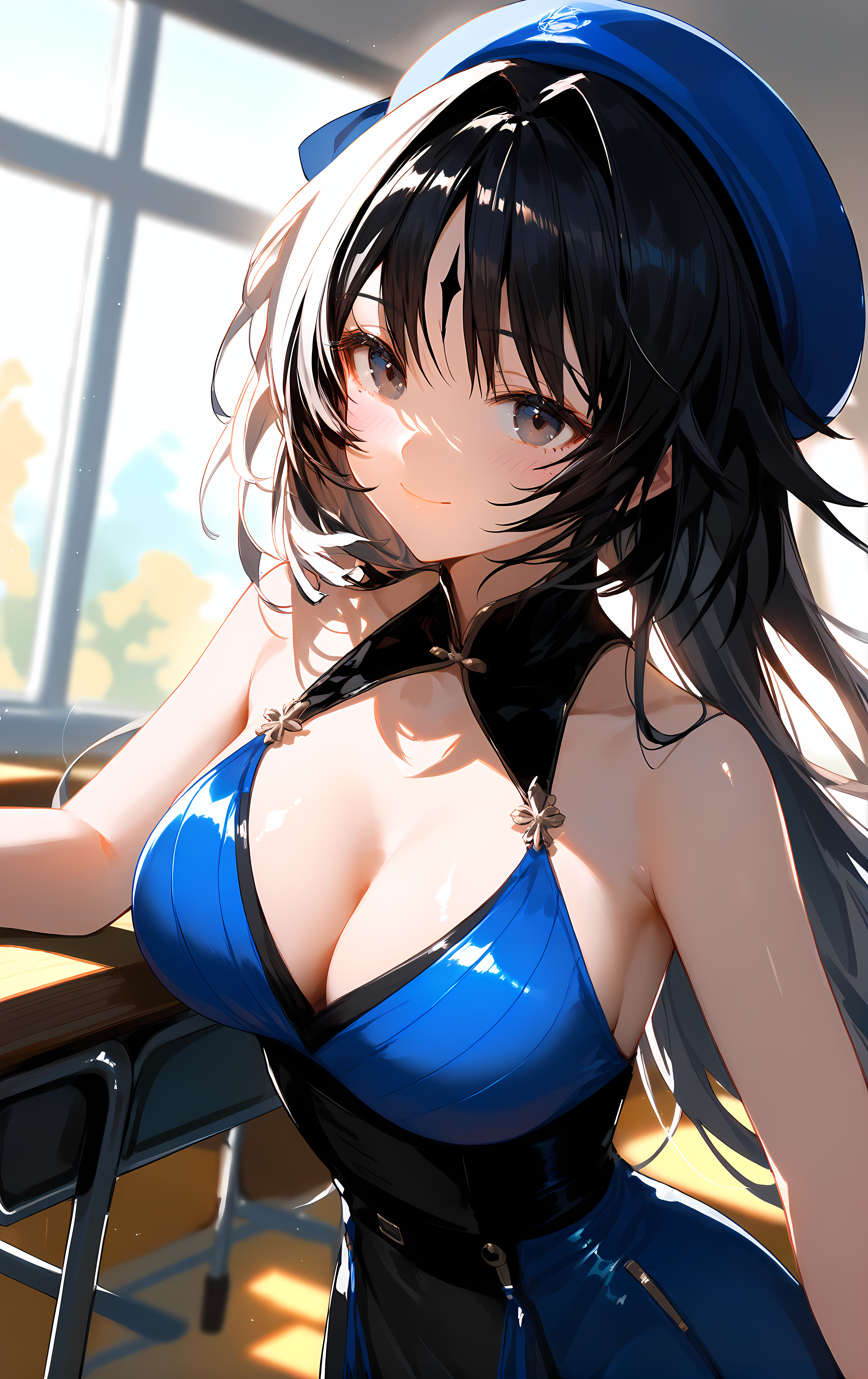 yang, 1girl, breasts, solo, pantyhose, long_hair, black_hair, hat, cleavage, blue_headwear, high_heels, black_footwear, boots, black_pantyhose, bare_shoulders, facial_mark, grey_eyes, medium_breasts, dress, closed_mouth, mole_under_eye, mole, high_heel_boots, bare_arms, sleeveless, beret, very_long_hair, blue_dress,