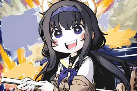 추천 프롬프트: yatte kita zo, smile, open mouth, teeth, holding, explosion