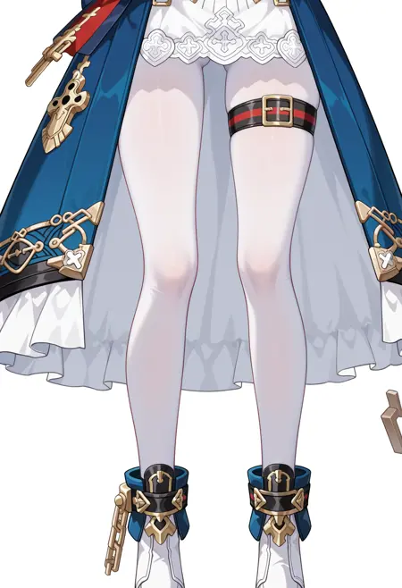 white bodysuit,veil,blue dress,white gloves,detached sleeves,white pantyhose,single thigh strap,white footwear,