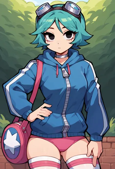 rflowers, turquoise hair, black eyes, eyelashes, goggles on head, chocker, blue hoodie, zipper, zipper pull tab, pink underwear
