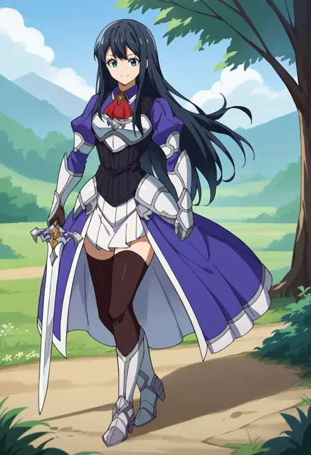 SuzuneInukamiDress, long hair, sidelocks, red ascot, armored dress, purple dress, black corset, collared dress, breastplate, gauntlets, black thighhighs, armored boots