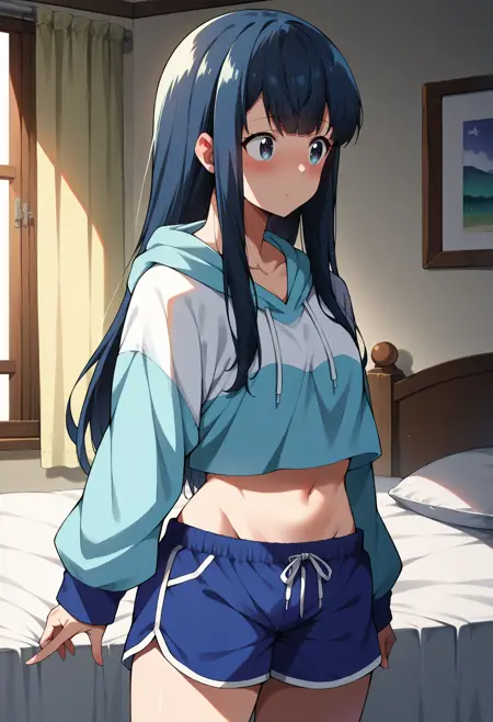 SuzuneInukamiDefault, long hair, sidelocks, red ascot, white capelet, white jacket, white uniform, long sleeves, belt, white shorts, black thighhighs